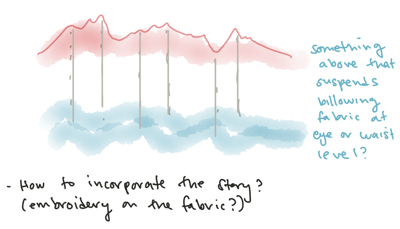 I wanted to incorporate the softness of the mist or the reflectiveness of the water a lot, so I wondered if I could recreate at least the mist with thin fabric that would billow (perhaps with a small fan to the side?)—and I liked that idea also because it'd be a nod to all the beautiful, flowing clothes that appear in Wuxia movies.