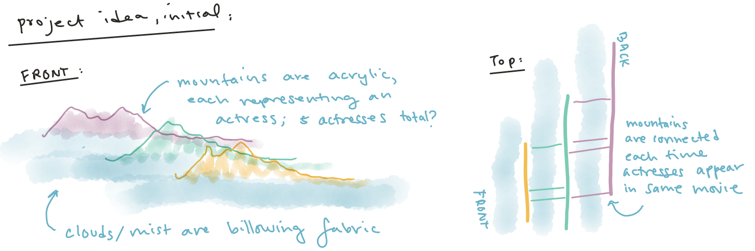 I also wanted to incorporate the idea of the earlier actresses paving the way for later actresses, by connecting the mountains (top view). I'm not 100% satisfied with this visual yet, because what I want to get across is that the earlier actresses were the pillars, and simply connecting them doesn't achieve the effect.