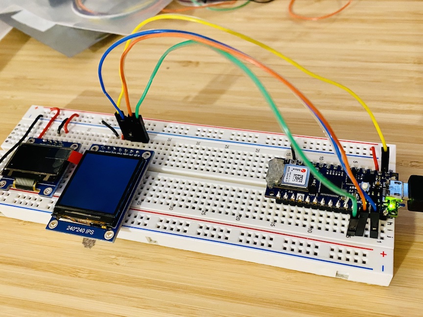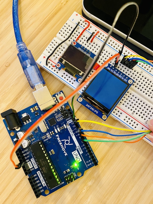 Once I had the TFT going, I knew that I wanted to get the OLED and TFT running at the same time off the same Arduino. I had a minor bug where the OLED screen wasn't displaying once I had ported the TFT code in, but quickly figured out it was because in the porting process I changed the OLED font color to the same light blue as the TFT...which of course wouldn't work since the OLED is monochrome and thus I can only draw black and white.