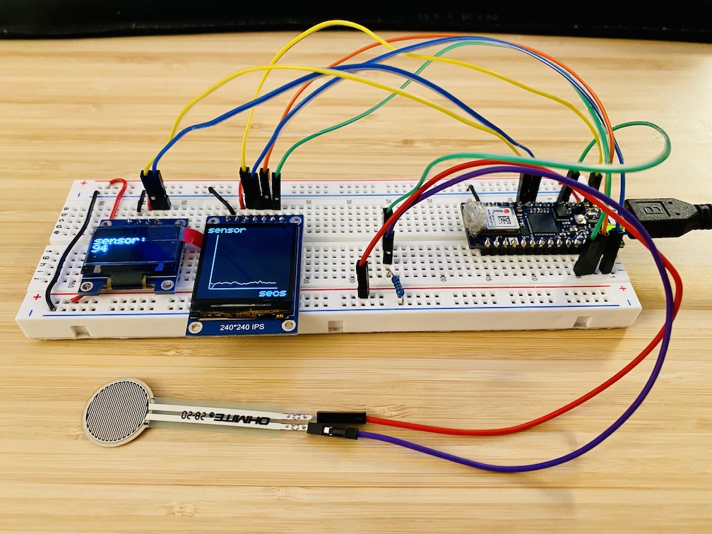 Once I got the two screens going, I hooked up a Force Sensing Resistor (with this PCOMP lab to remind me the wiring) and VOILÀ: