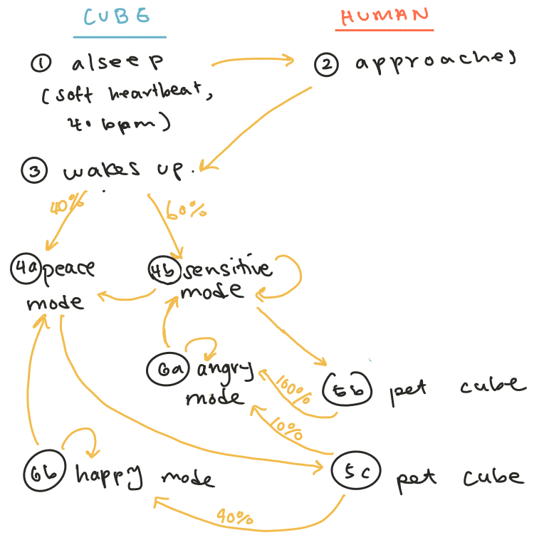 - If cube is ASLEEP and person approaches, it wakes up and has 60% probability of entering PEACE mode and 40% of SENSITIVE mode