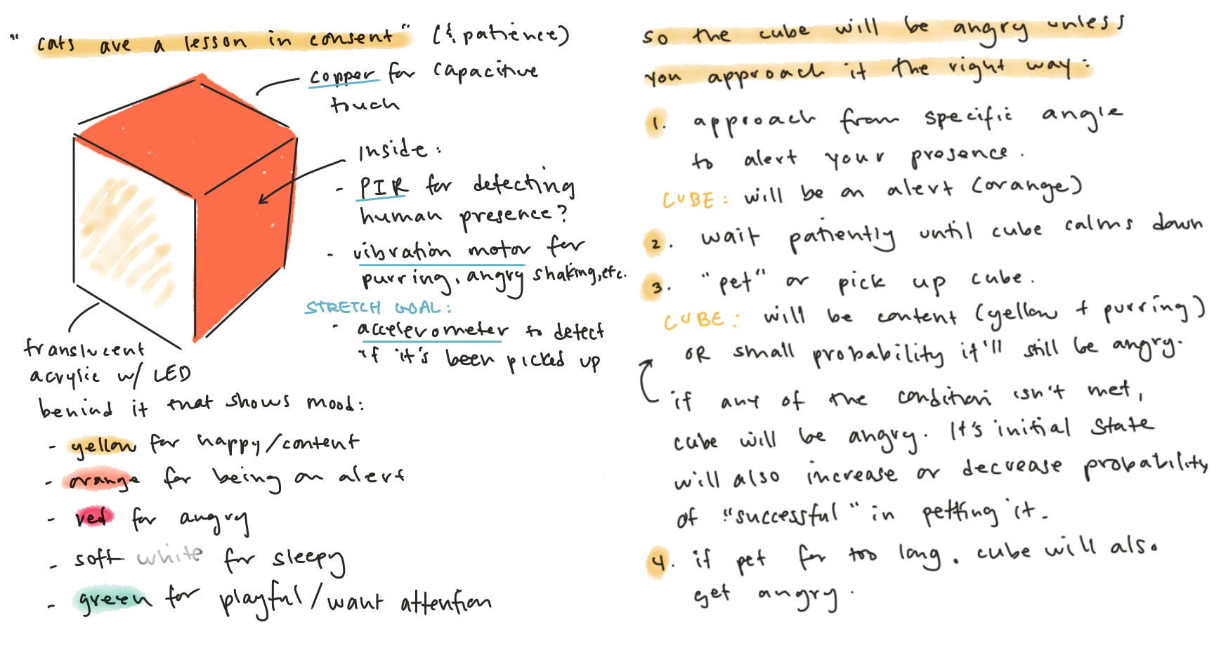 After talking to Luhan, we both ended up liking the idea of a cube with a cat like personality. In particular, I couldn't get this phrase out of my mind: "cats are a lesson in consent".